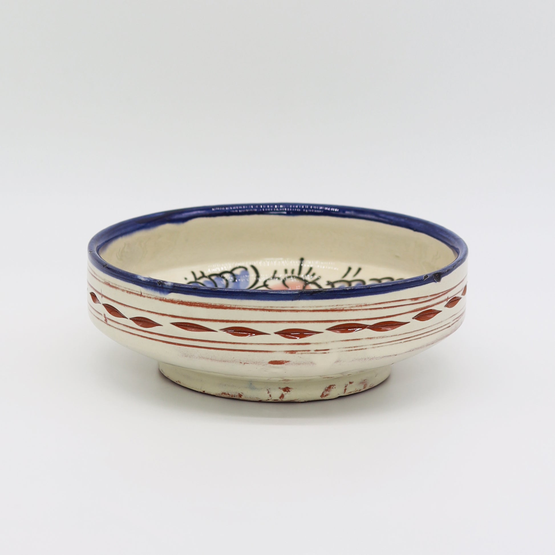 Big comfort, big colour, big character. This hand-painted ceramic pasta bowl is made in Morocco and features a rich, floral-inspired motif in terracotta red, indigo blue, and soft golden yellow. Each one is finished with a bold painted rim and footed base, perfect for serving up your favourite pasta, risotto or salad in style.