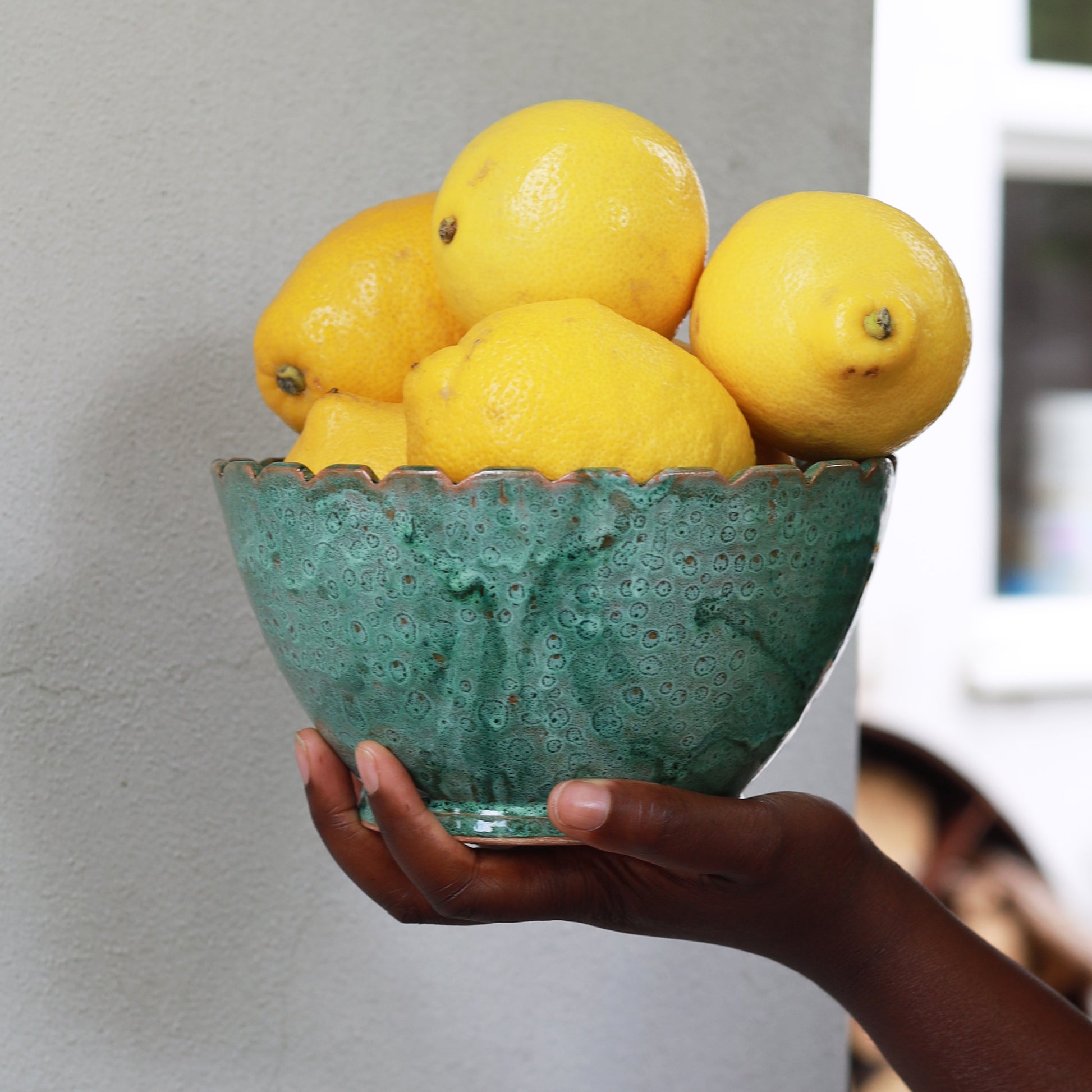 Earthy, bold, and beautifully versatile. These handmade Moroccan bowls are finished in a deep mossy green glaze with a speckled, textured finish and a scalloped edge that adds just the right touch of charm. Available in three sizes, they’re designed to suit every kind of moment, from weekday snacking to generous sharing dishes.