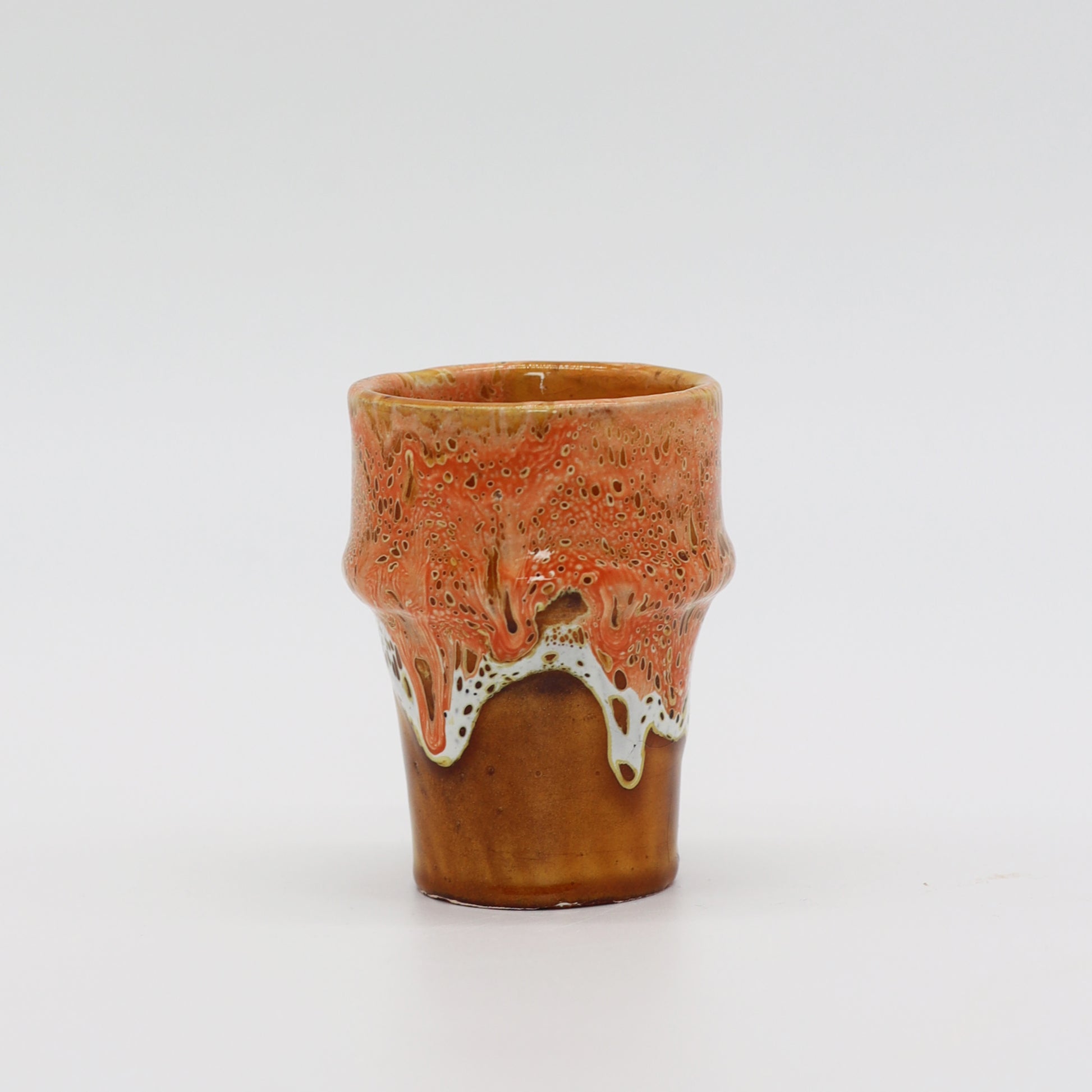 Like a sunset poured in clay. This handmade Moroccan ceramic cup features a molten, lava-like glaze in fiery coral, soft cream, and rich earth tones. The flowing drip design is created through a reactive glaze process, making each piece a one-of-a-kind work of art.