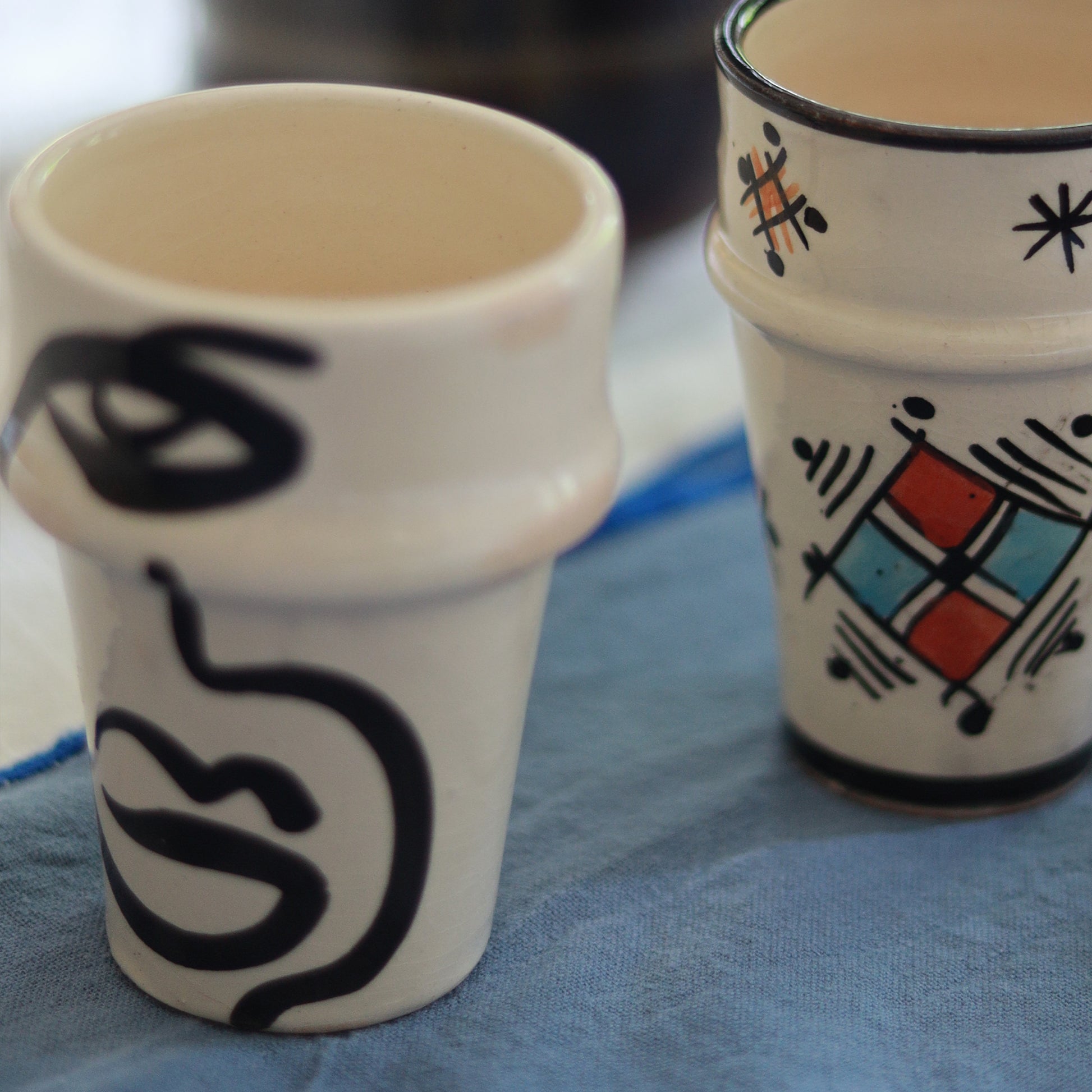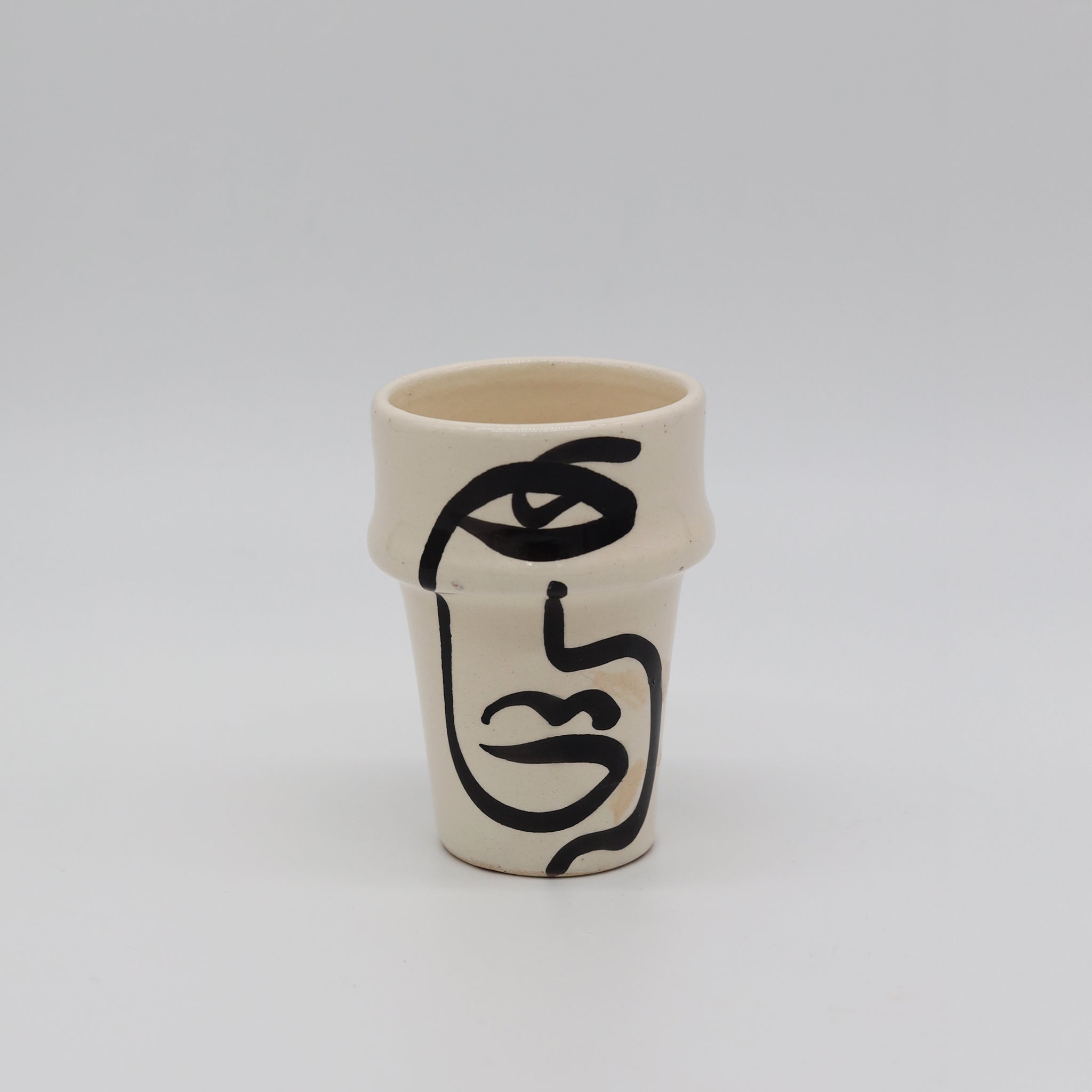 Bold, modern, and full of expression. This hand-painted Moroccan ceramic cup features a single continuous line forming a stylised face which is simple, striking, and a little bit mysterious. The clean contrast of black on cream makes it feel both artful and easy-going, equally at home on a shelf or filled with your morning brew.