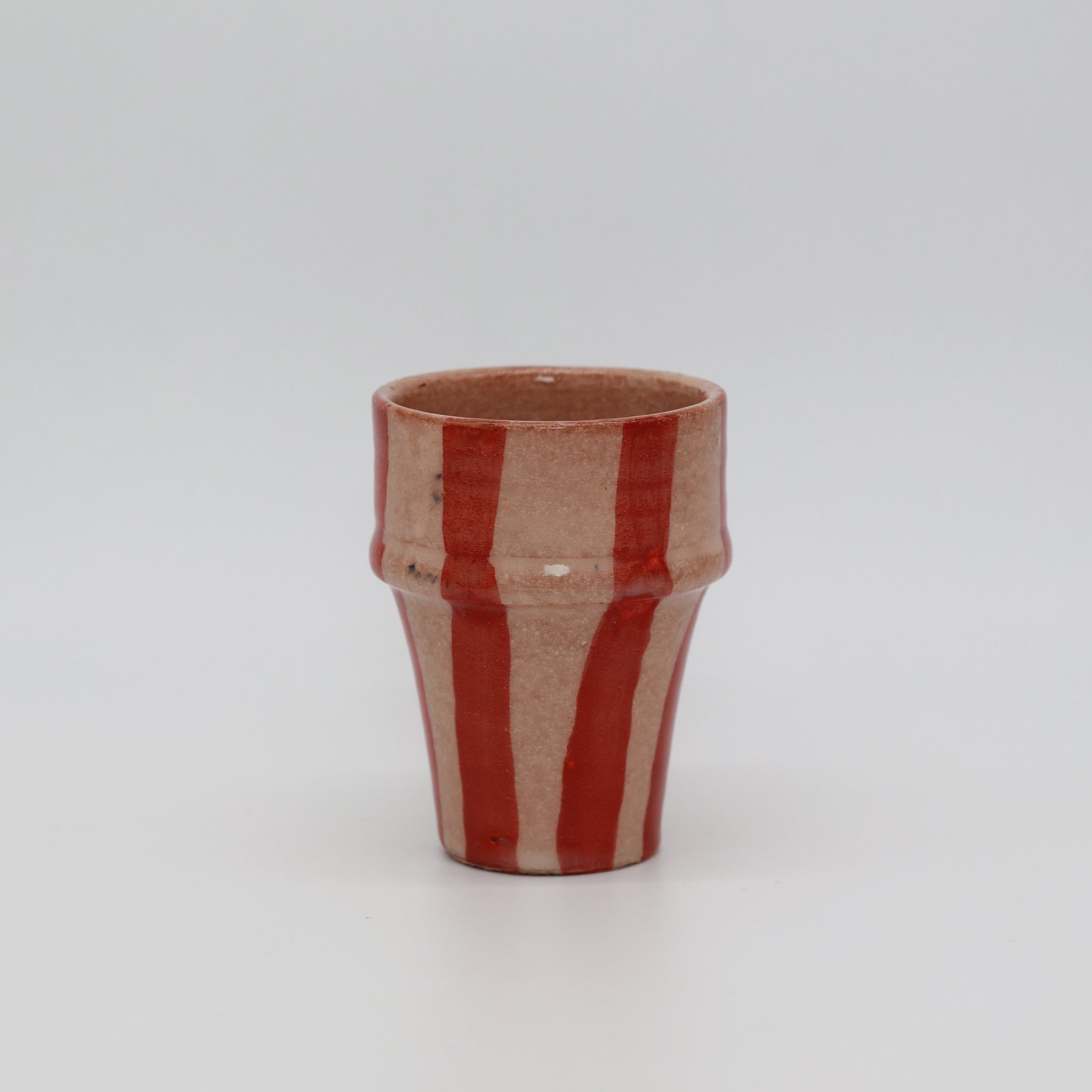 Striking in its simplicity, this hand-thrown Moroccan ceramic cup features bold red vertical stripes over a natural clay base. The playful irregularity of the brushstrokes gives it a warm, handmade feel, like something you’d find at a countryside market and use forever.