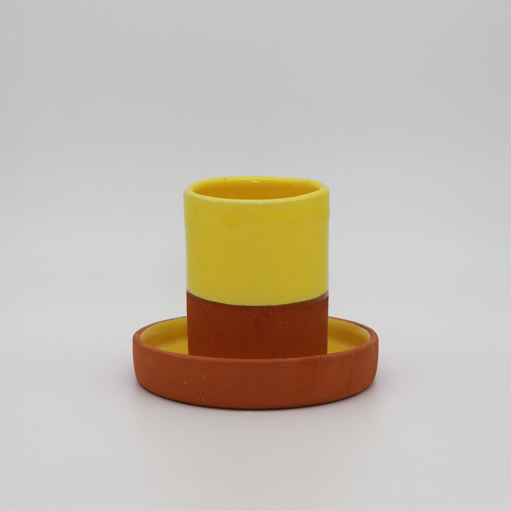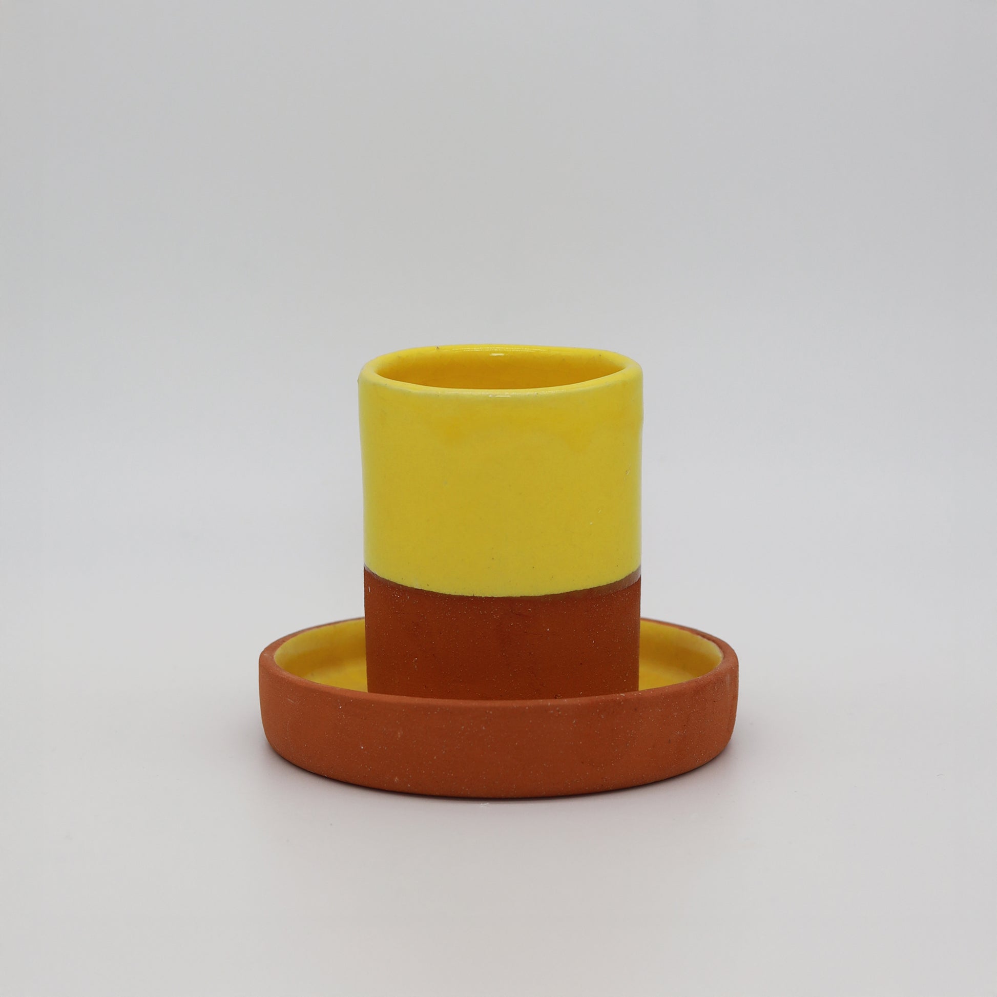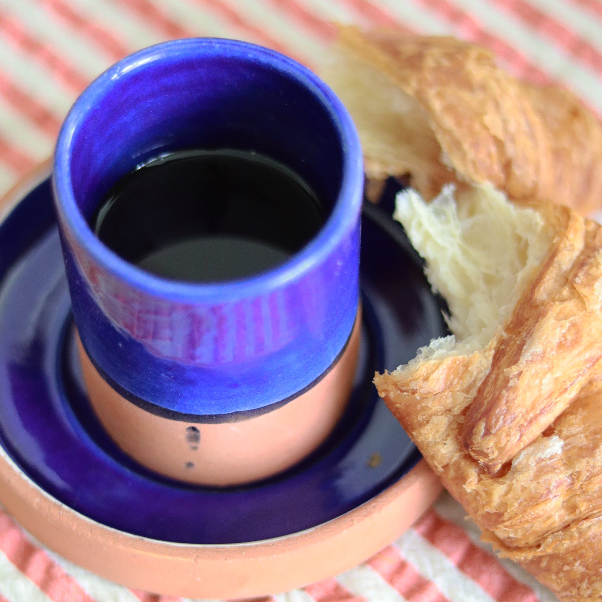 A little colour, a lot of charm. These two-tone ceramic mugs and matching saucers are handcrafted in Morocco and glazed in bold shades of cobalt blue, moss green, or sunshine yellow. Each piece pairs glossy colour with warm, earthy terracotta, designed to brighten up your coffee rituals and open shelving alike.