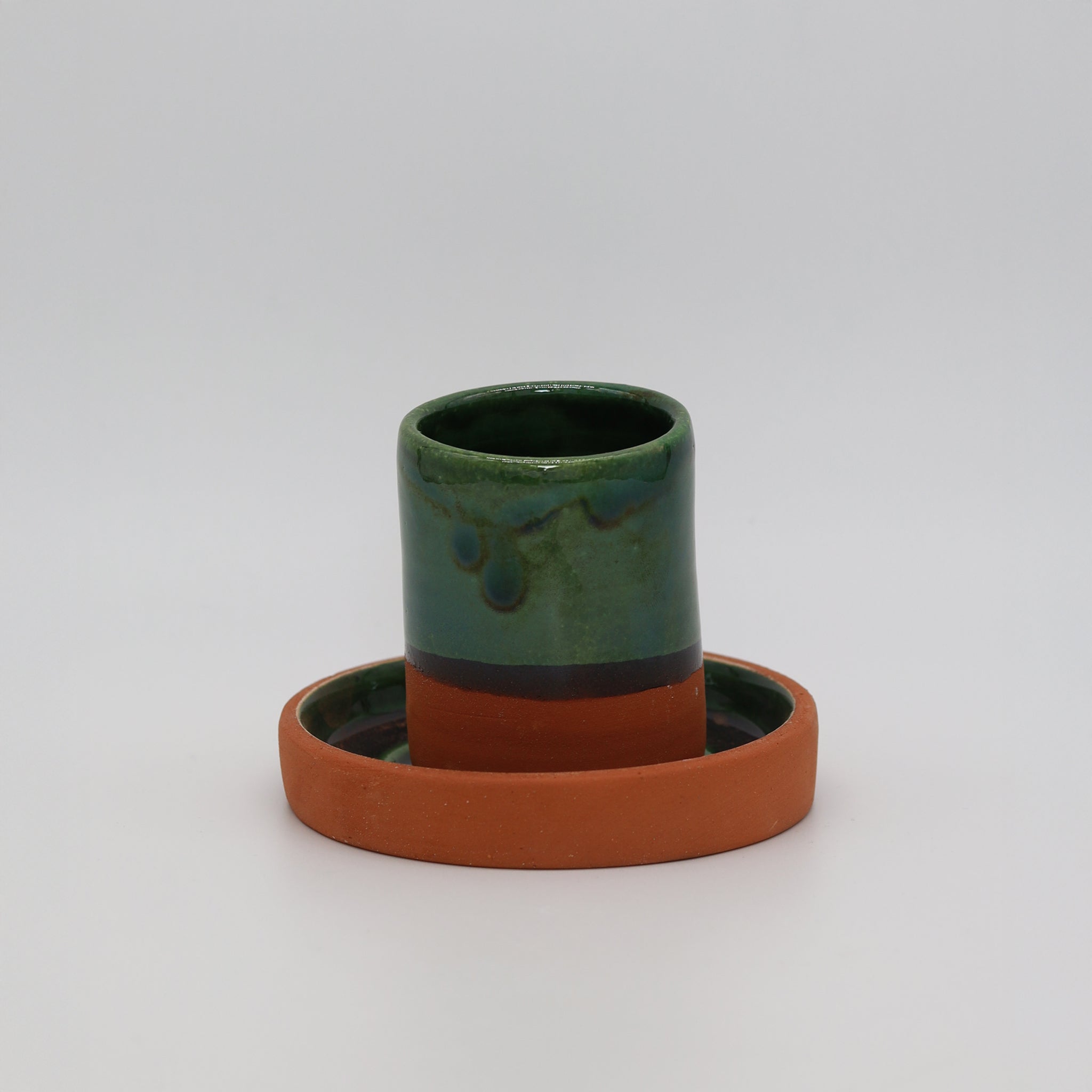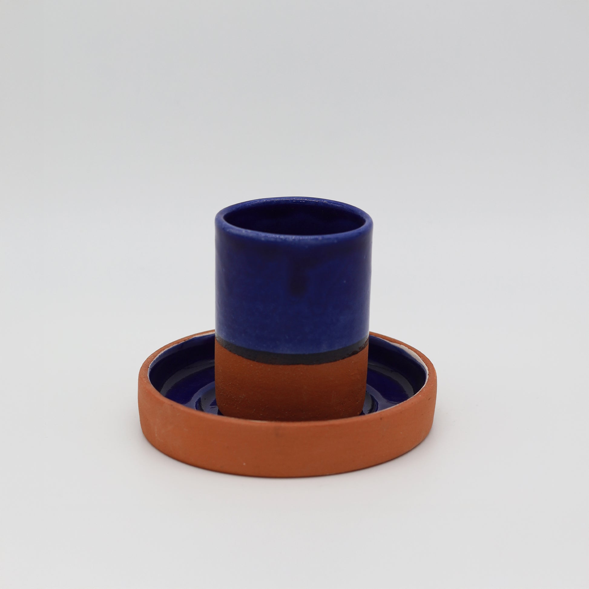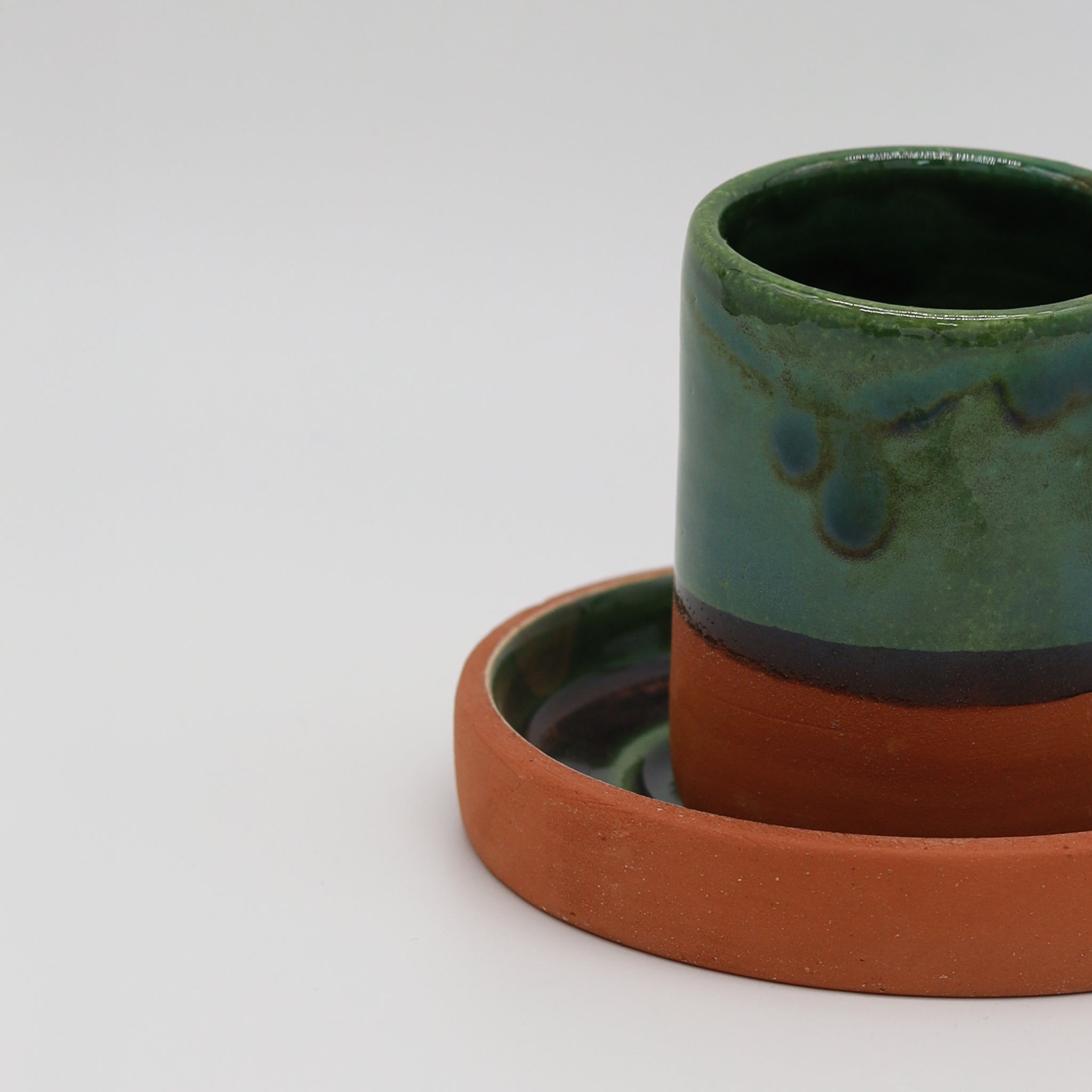 A little colour, a lot of charm. These two-tone ceramic mugs and matching saucers are handcrafted in Morocco and glazed in bold shades of cobalt blue, moss green, or sunshine yellow. Each piece pairs glossy colour with warm, earthy terracotta, designed to brighten up your coffee rituals and open shelving alike.